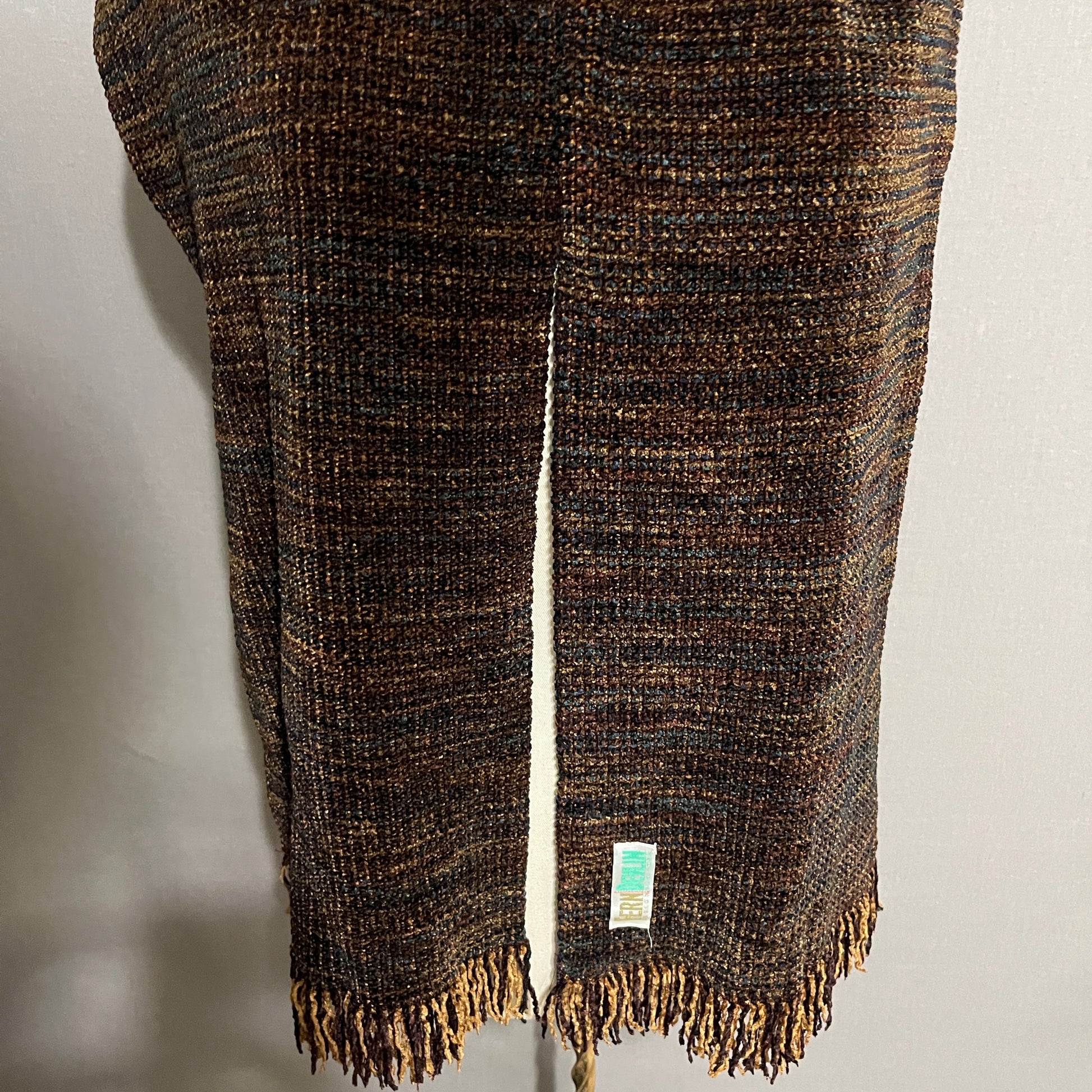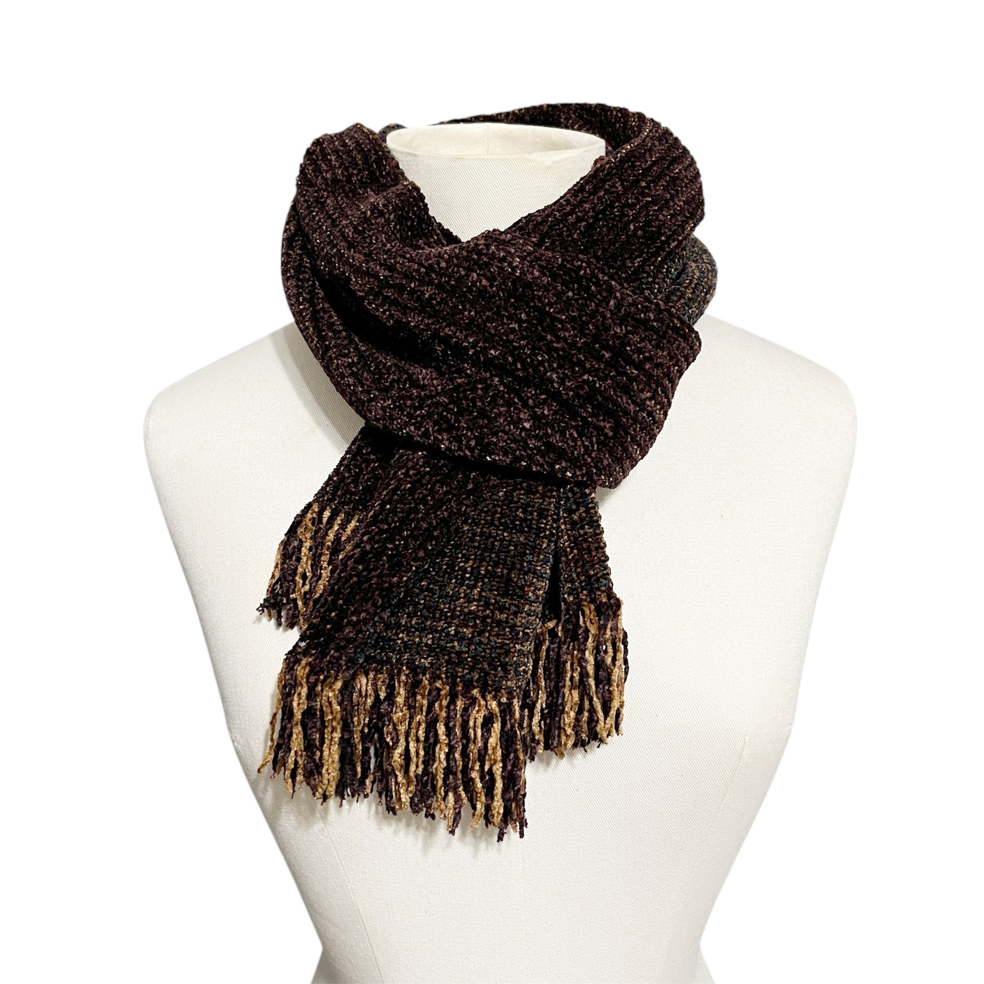 Elevate your look with this chic dark brown and tan scarf. A perfect accessory for any occasion.