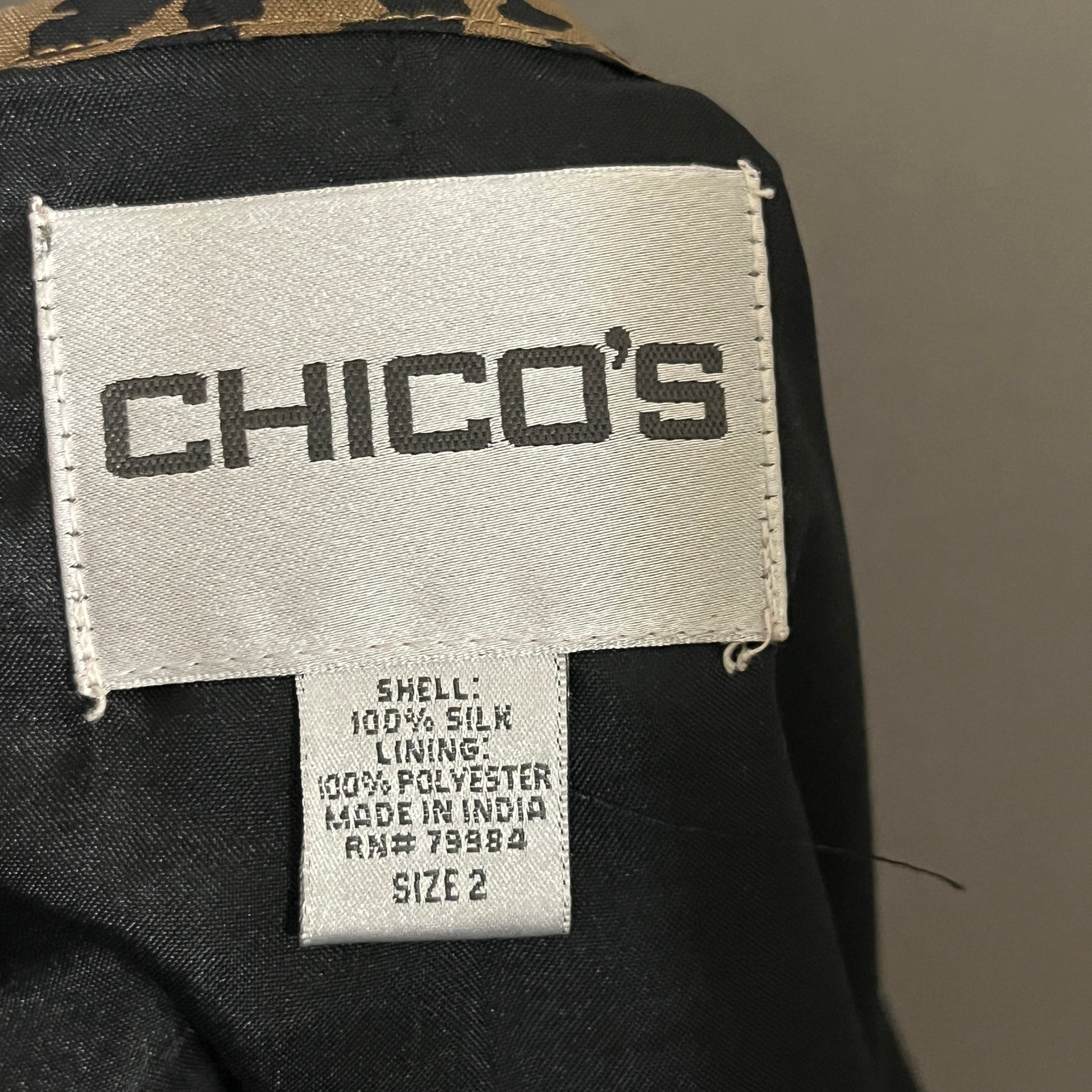 Chico's silk jacket. Features black and tan colors. Sophisticated design.