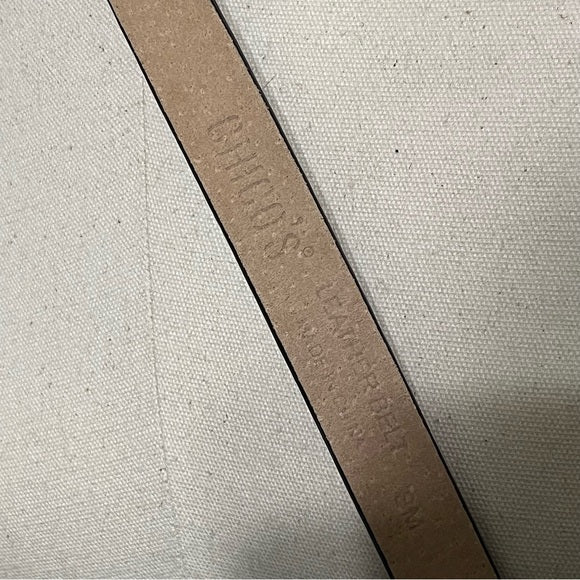 Details: Chicos Chocolate Brown Thin Antique Gold Jeweled Leather Adjustable Belt, With gold buckle stretch for added detail. Gently used condition, please see photos for flaws! Please look through all photos for any flaws to verify the condition. Major flaws will be disclosed.