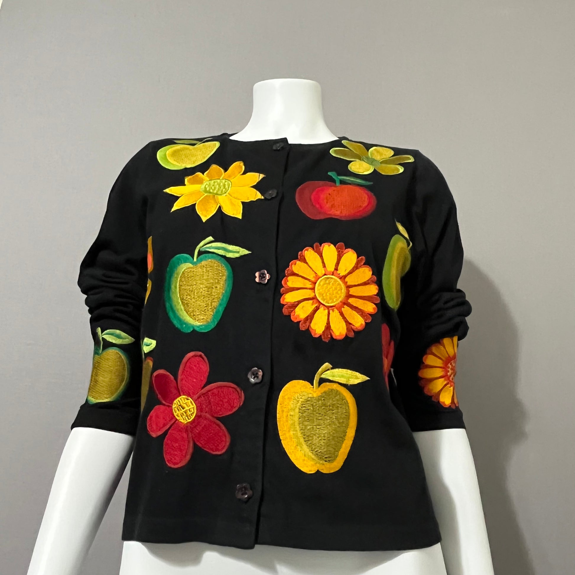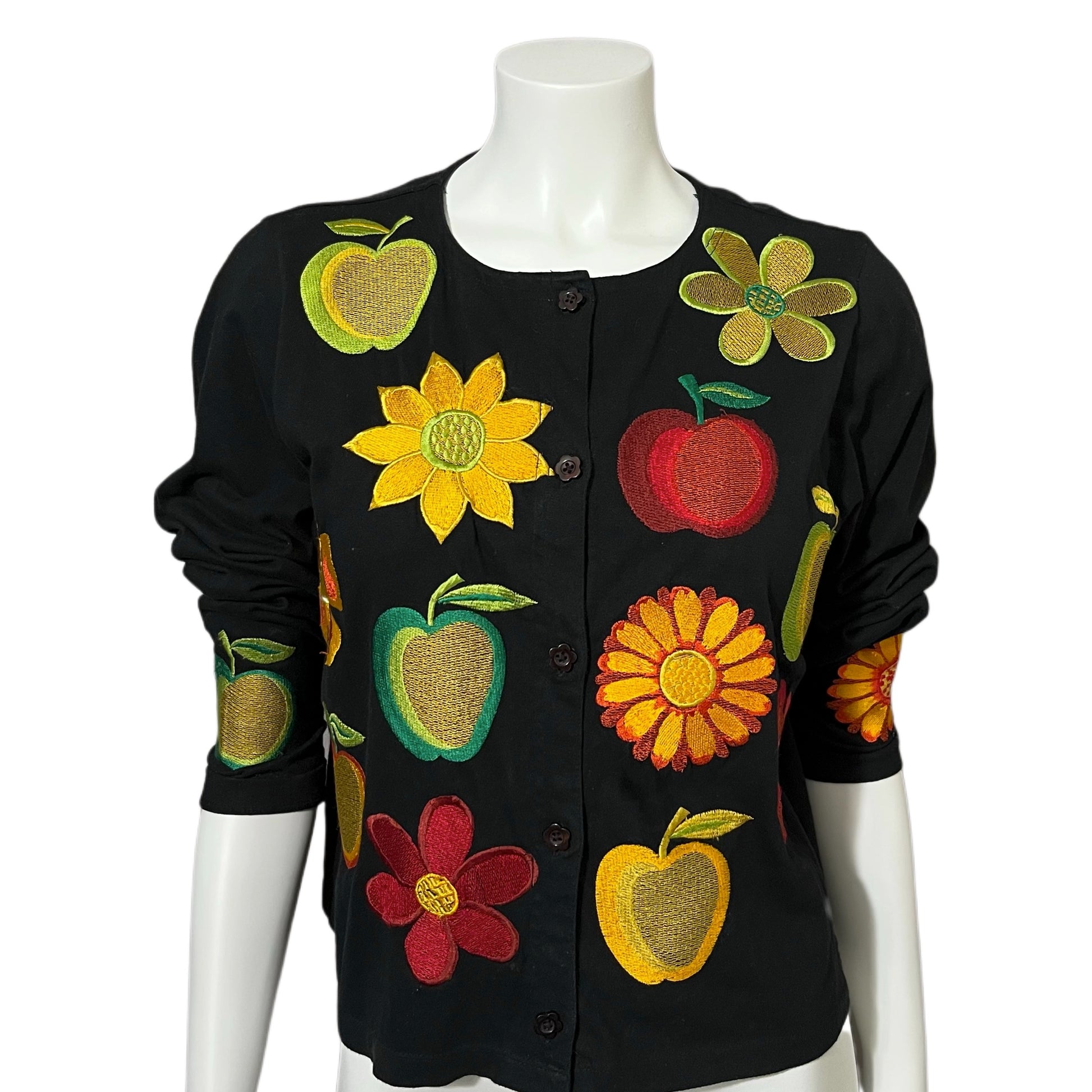 Cotton Black Fruit Embroidered Open Front Blazer Sz-Medium