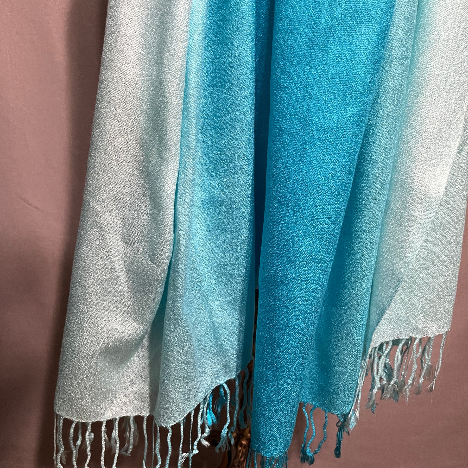Chic pashmina scarf in turquoise and sky blue. Soft and stylish. Ideal for any outfit.