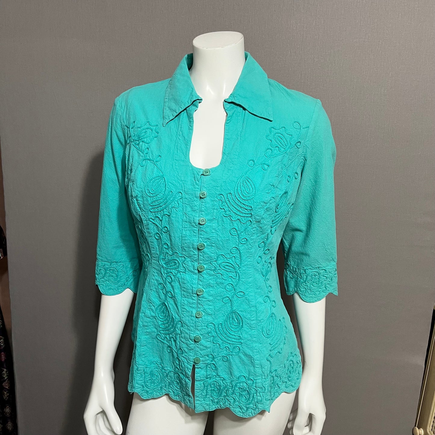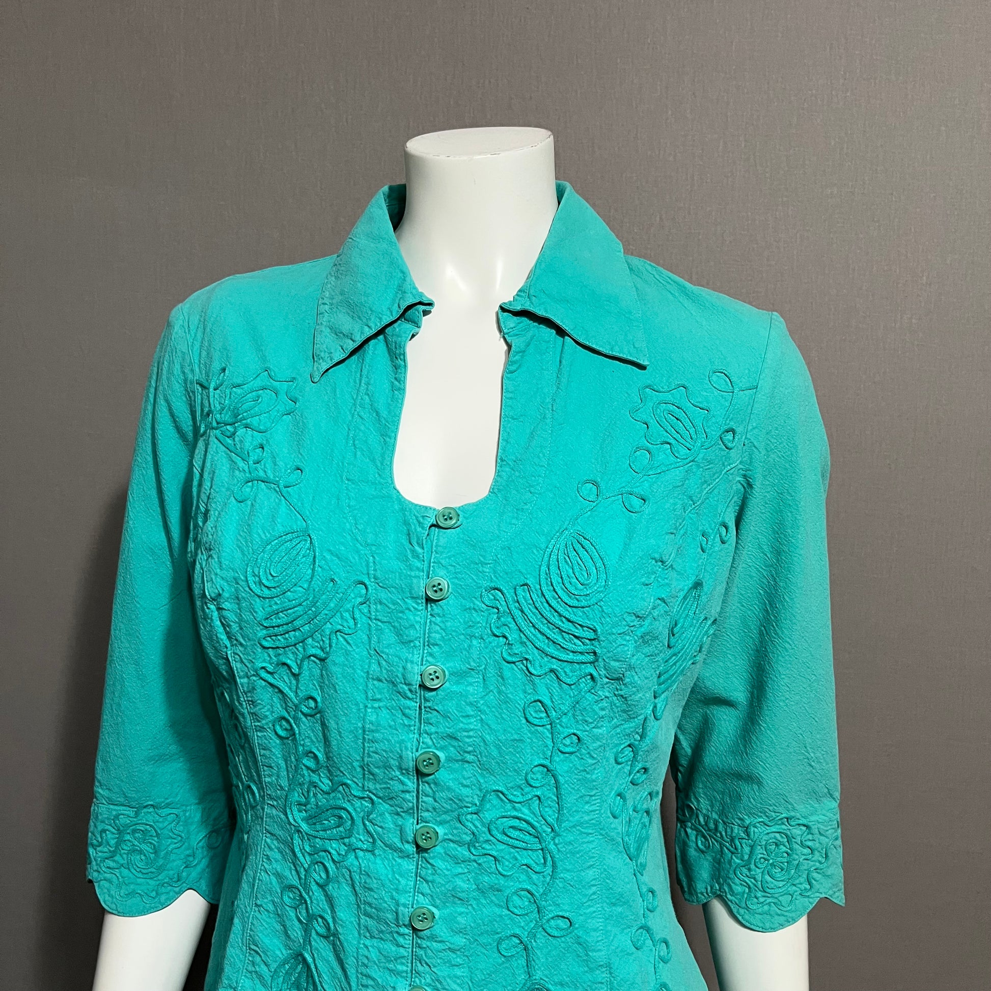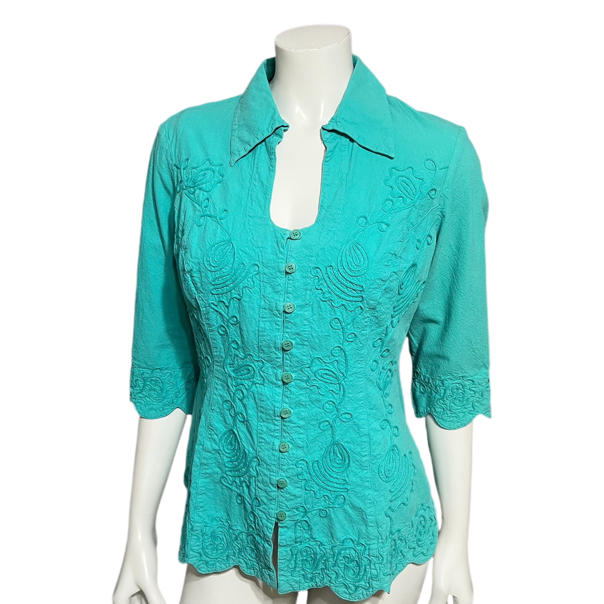 Gretty Ziegler Green Cotton Textured Short Sleeve Shirt Sz-Large