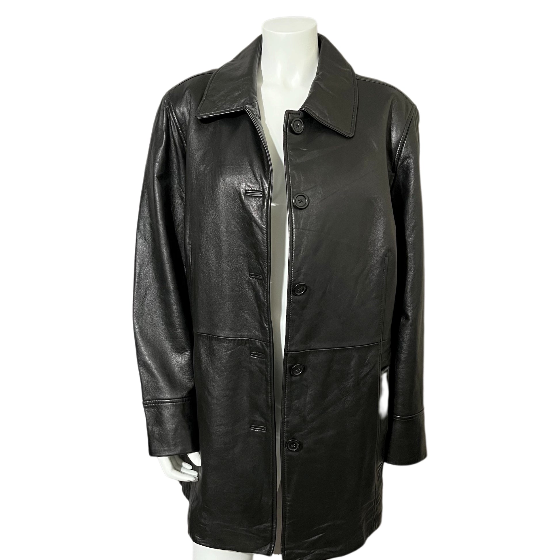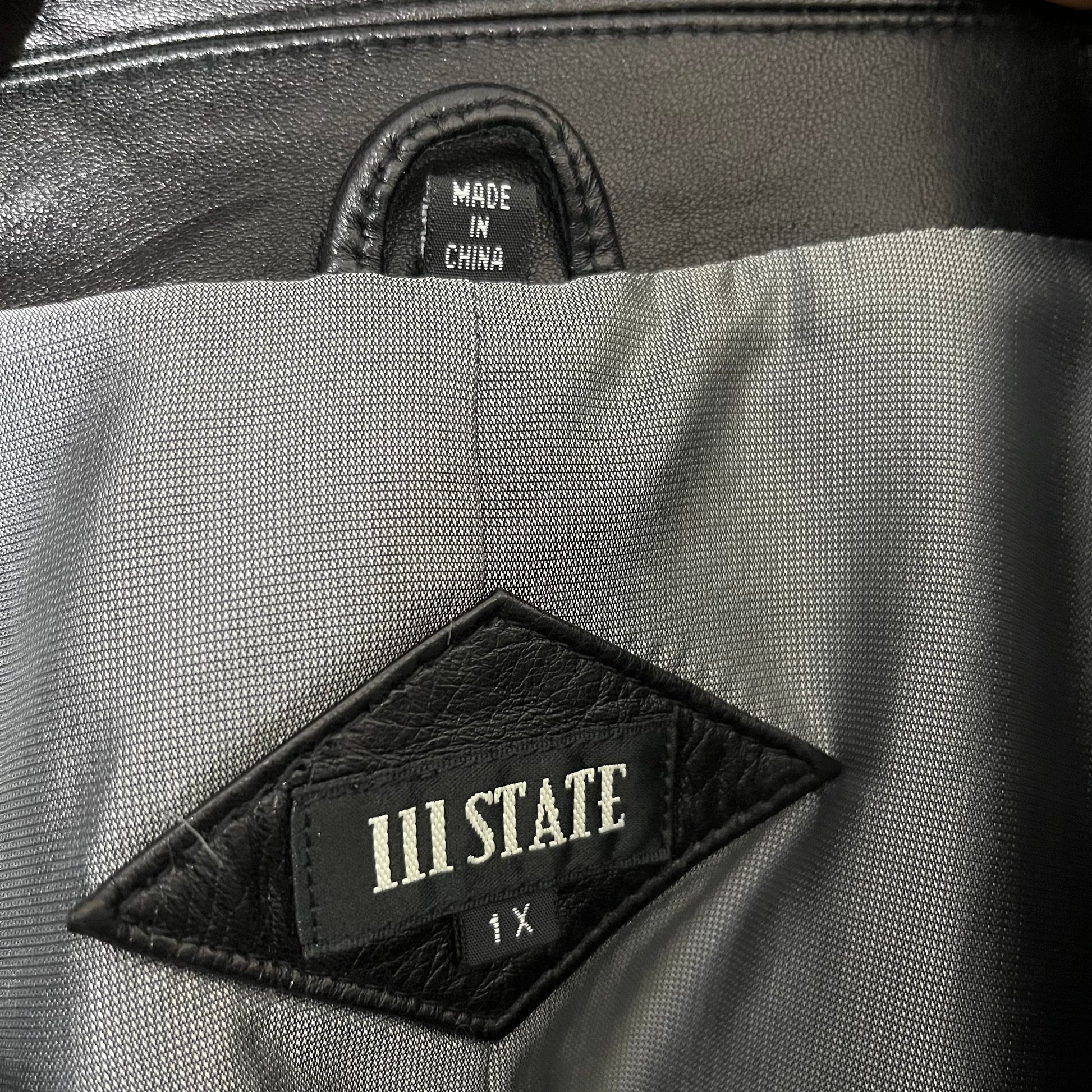 Details: III State Black Longline Leather Jacket, With Pockets and button for added detail. Gently used condition, please see photos for flaws! Please look through all photos for any flaws to verify the condition. Major flaws will be disclosed.