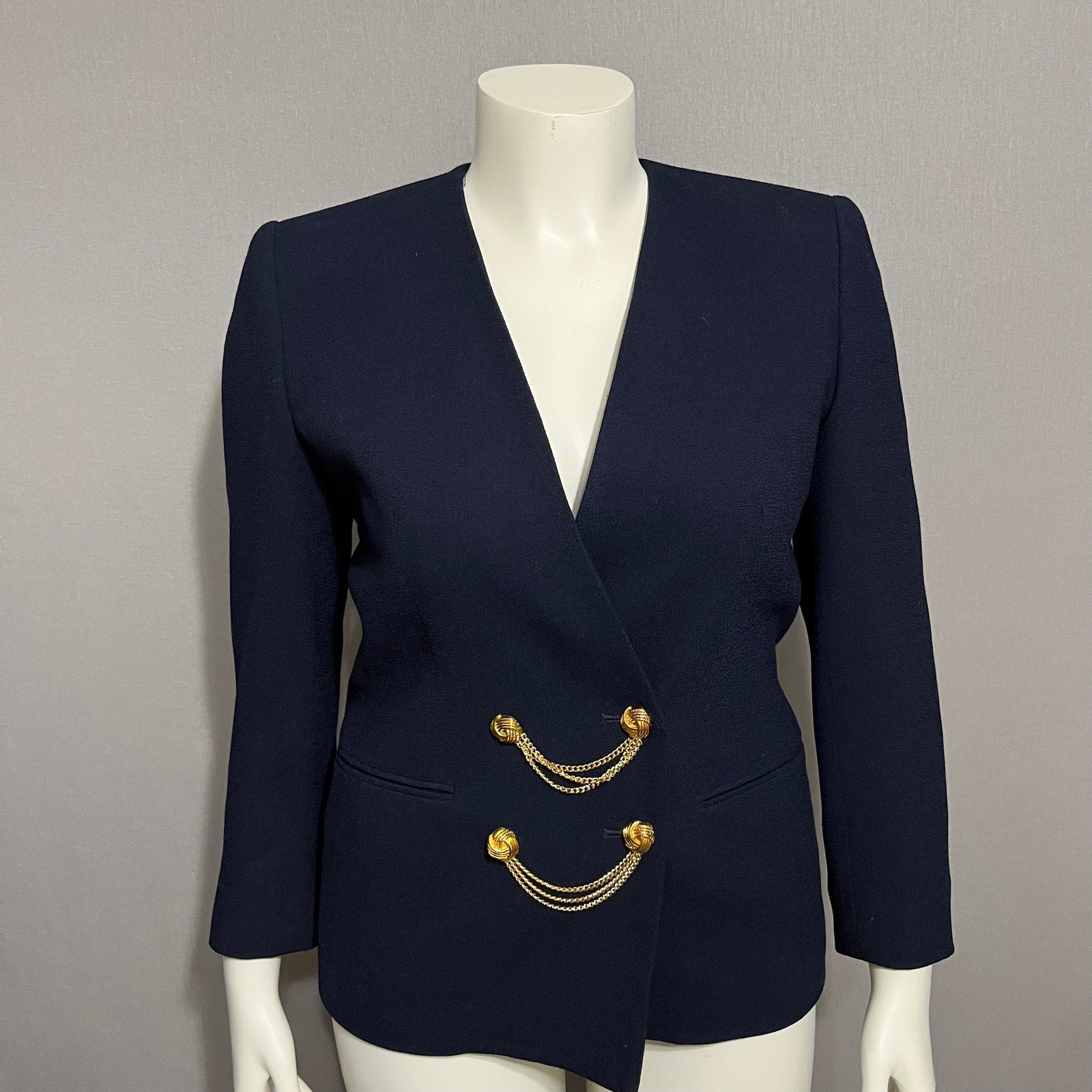 Kasper Navy Draped Gold Chain Collarless Career Blazer Sz-6P