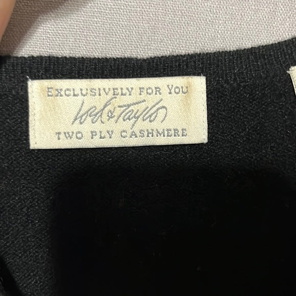 Details: Lord & Taylor 2-ply cashmere black v-neck sweater, with pullover for a added detail. Gently used condition, please see photos for flaws! Please look through all photos for any flaws to verify the condition. Major flaws will be disclosed.