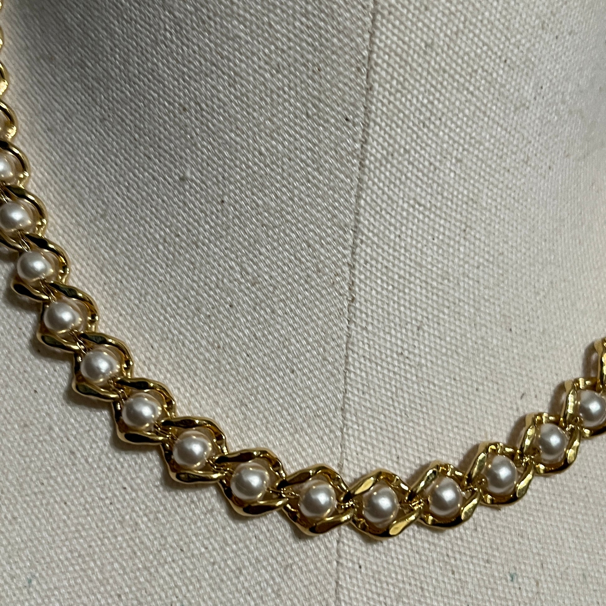 This elegant gold and pearl necklace adds a touch of sophistication to any outfit. Perfect for special occasions or everyday wear.