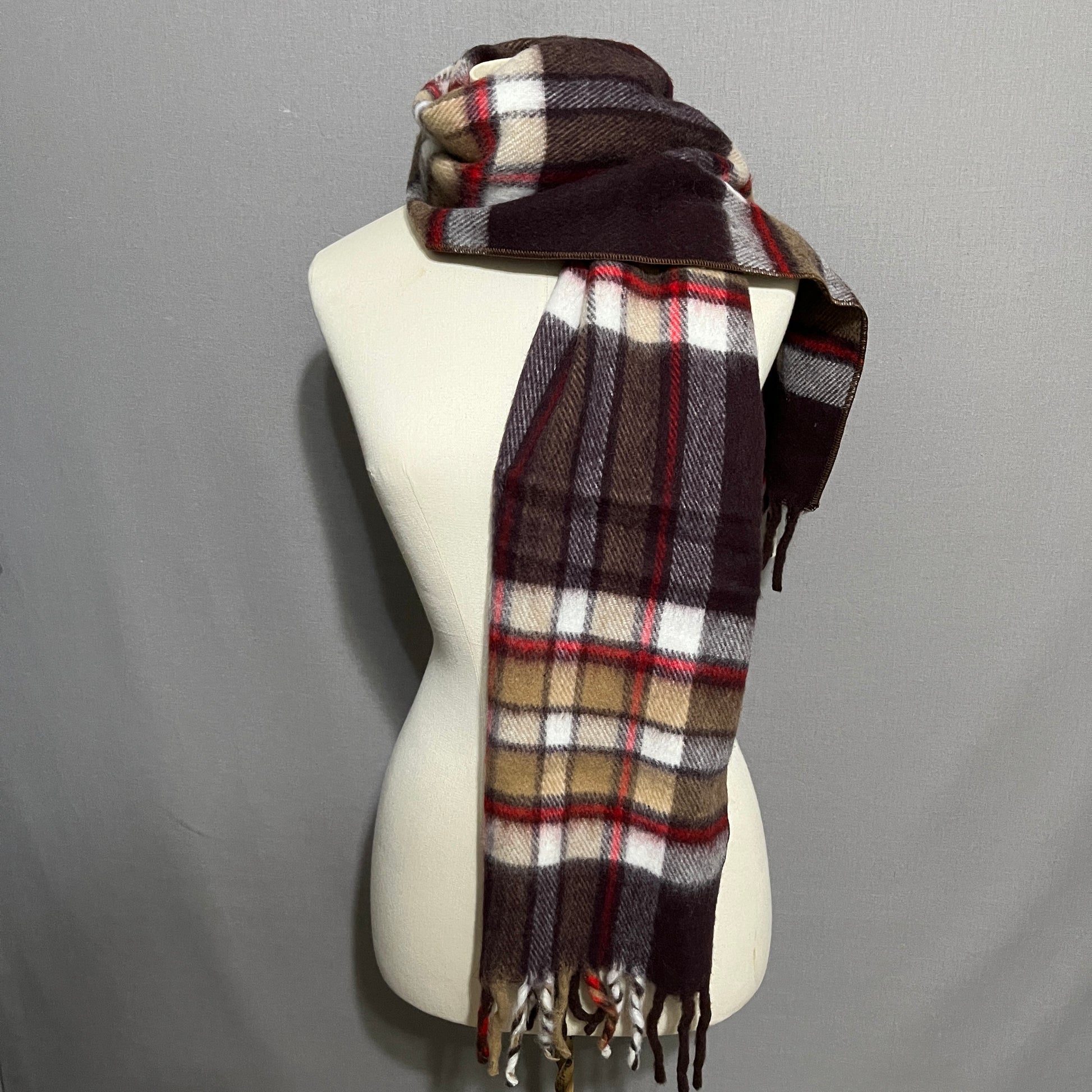 Cozy plaid wool scarf with fringe. Features red, brown, and cream colors.