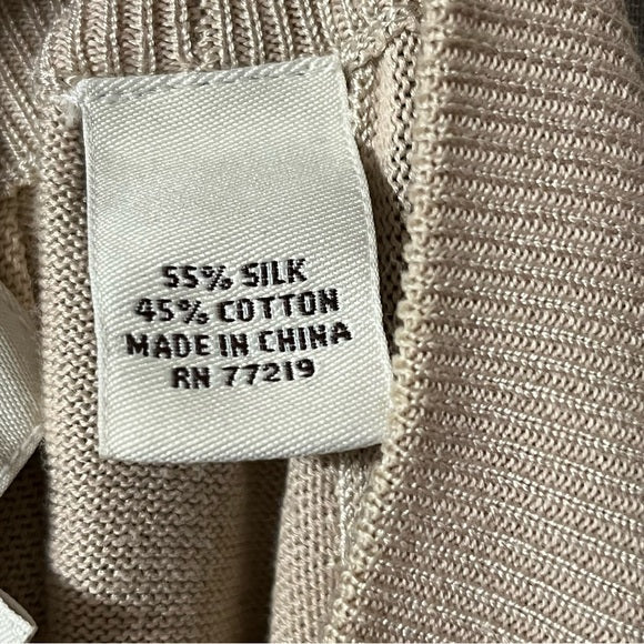 Details: Pronto Uomo Tan Silk Cotton Blend Mock Neck Sweater, with pullover added detail. Gently used condition, please see photos for flaws! Please look through all photos for any flaws to verify the condition. Major flaws will be disclosed.