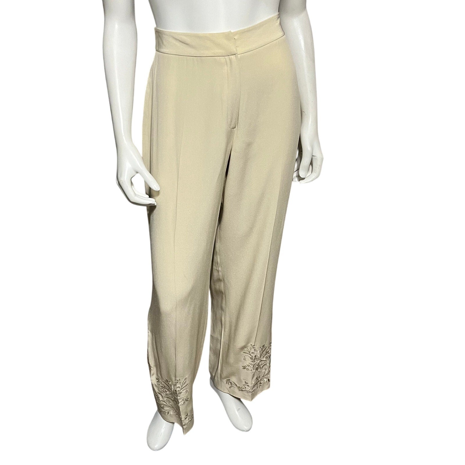 Rena Rowan Crème Silk Blend Embroidered Hem Trouser Pants Sz-6