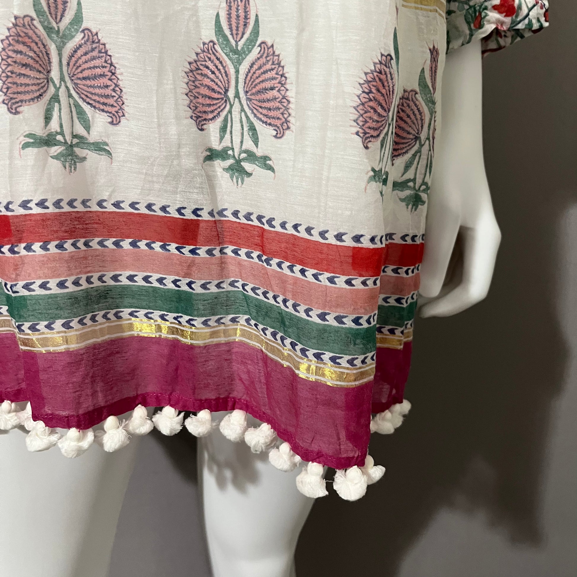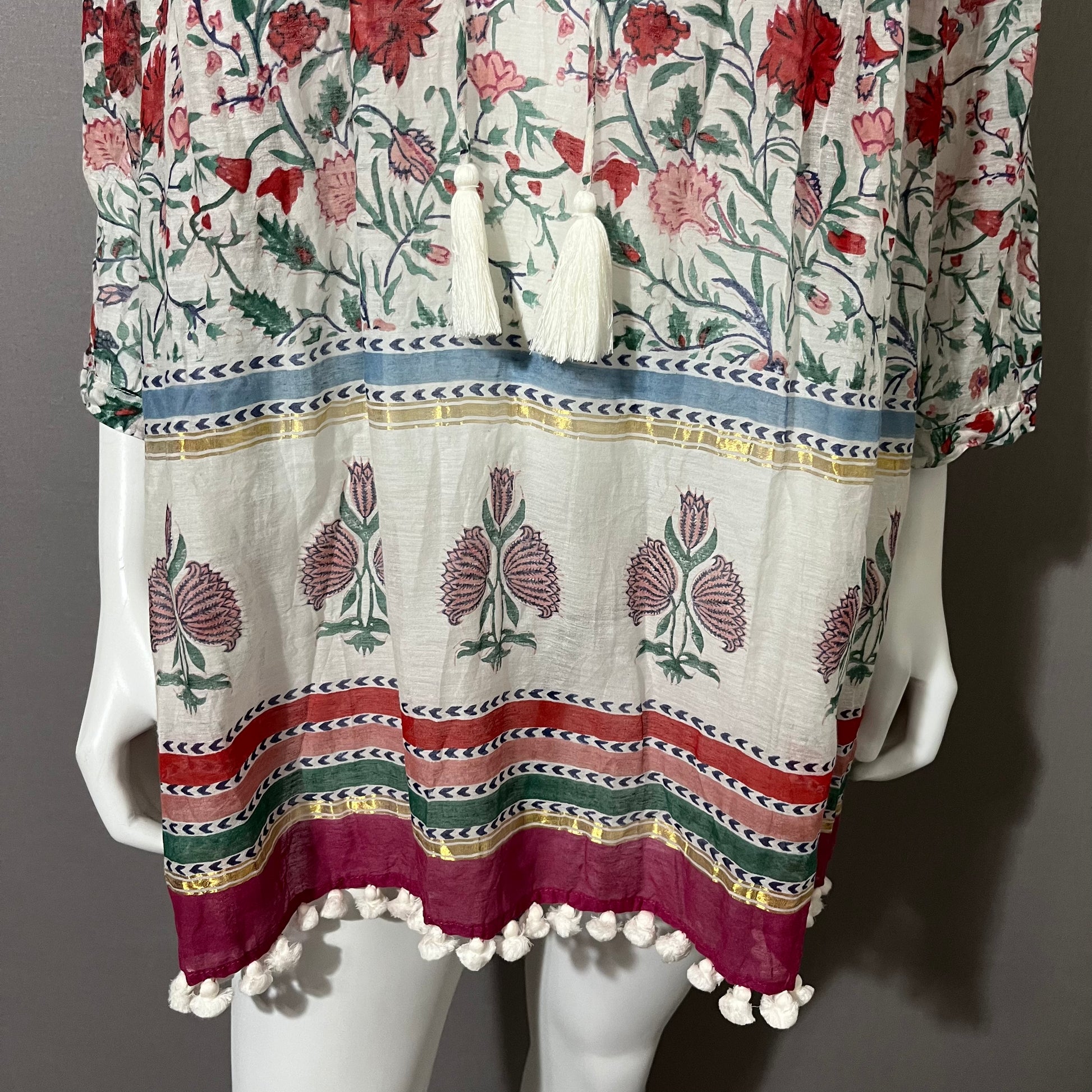 Details: Roller Rabbit cotton silk floral tunic top, with drawstring fringe and pom pom hem for added detail. Gently used condition, please see photos for flaws! Please look through all photos for any flaws to verify the condition. Major flaws will be disclosed.