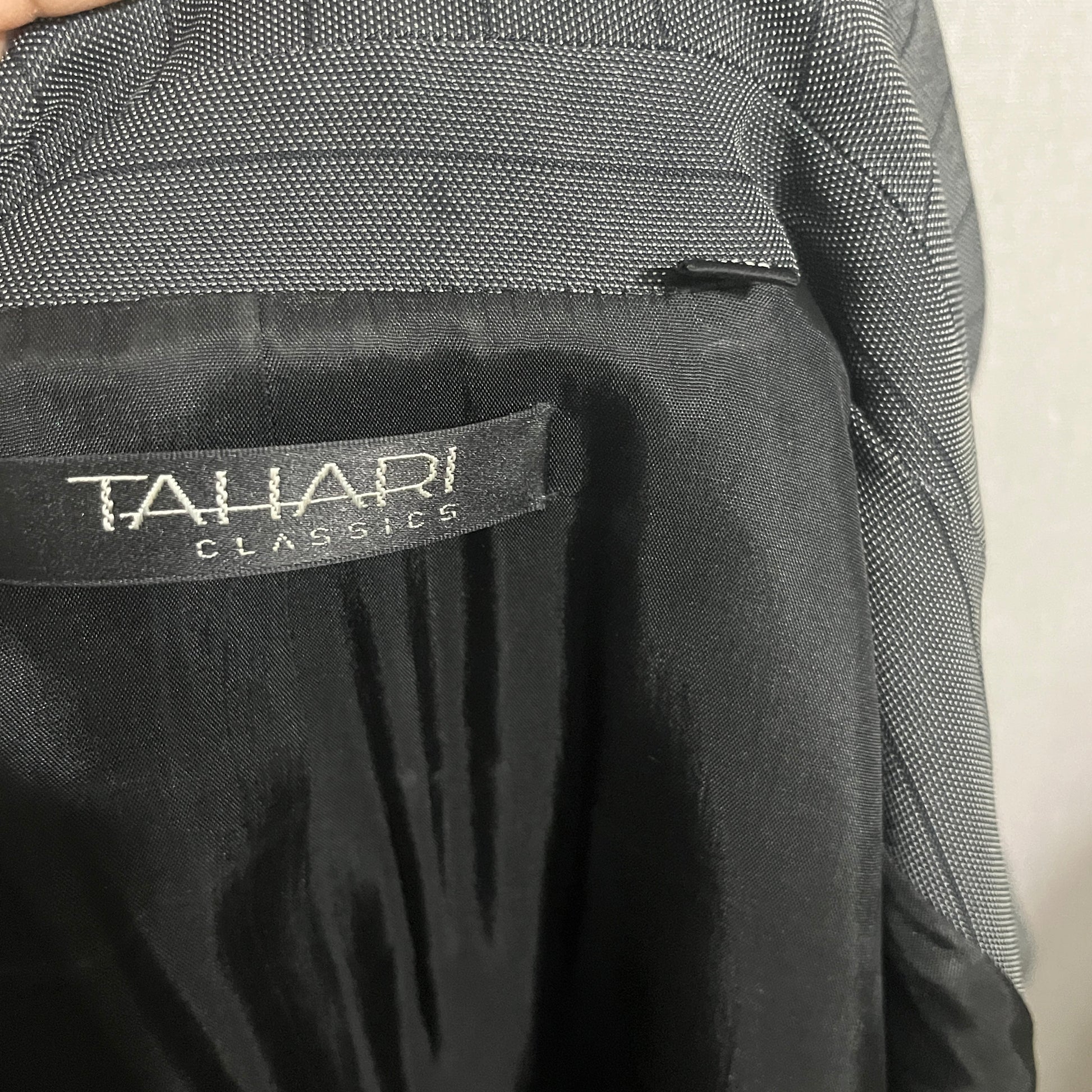 Stylish Tahari blazer in gray and black. Ideal for professional settings.