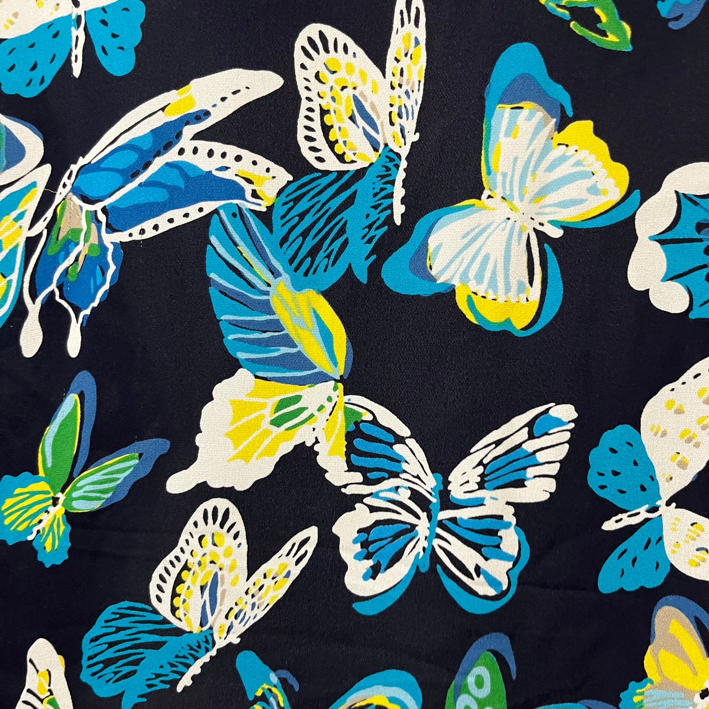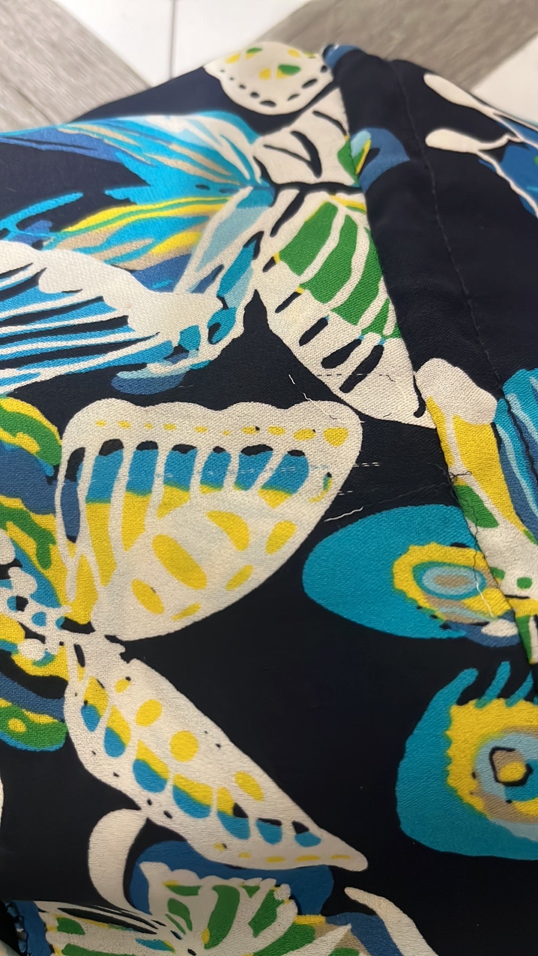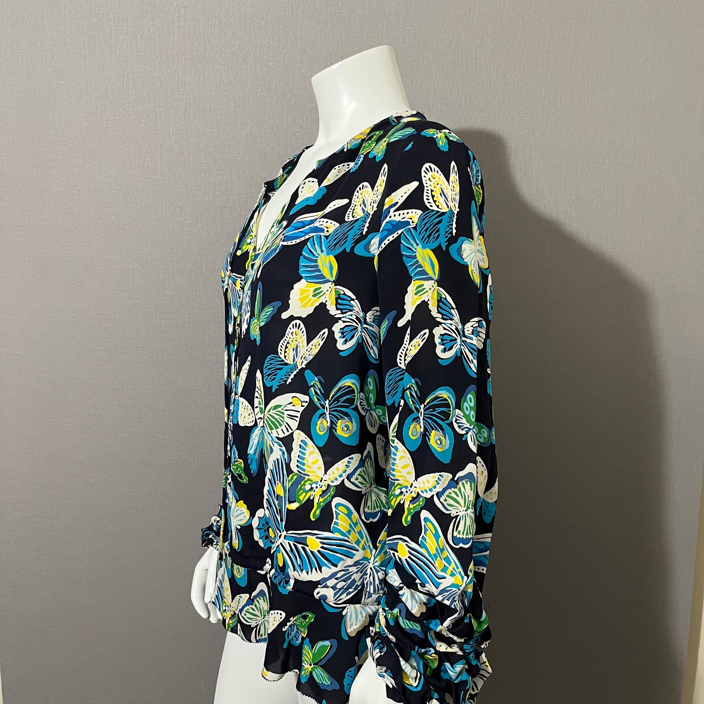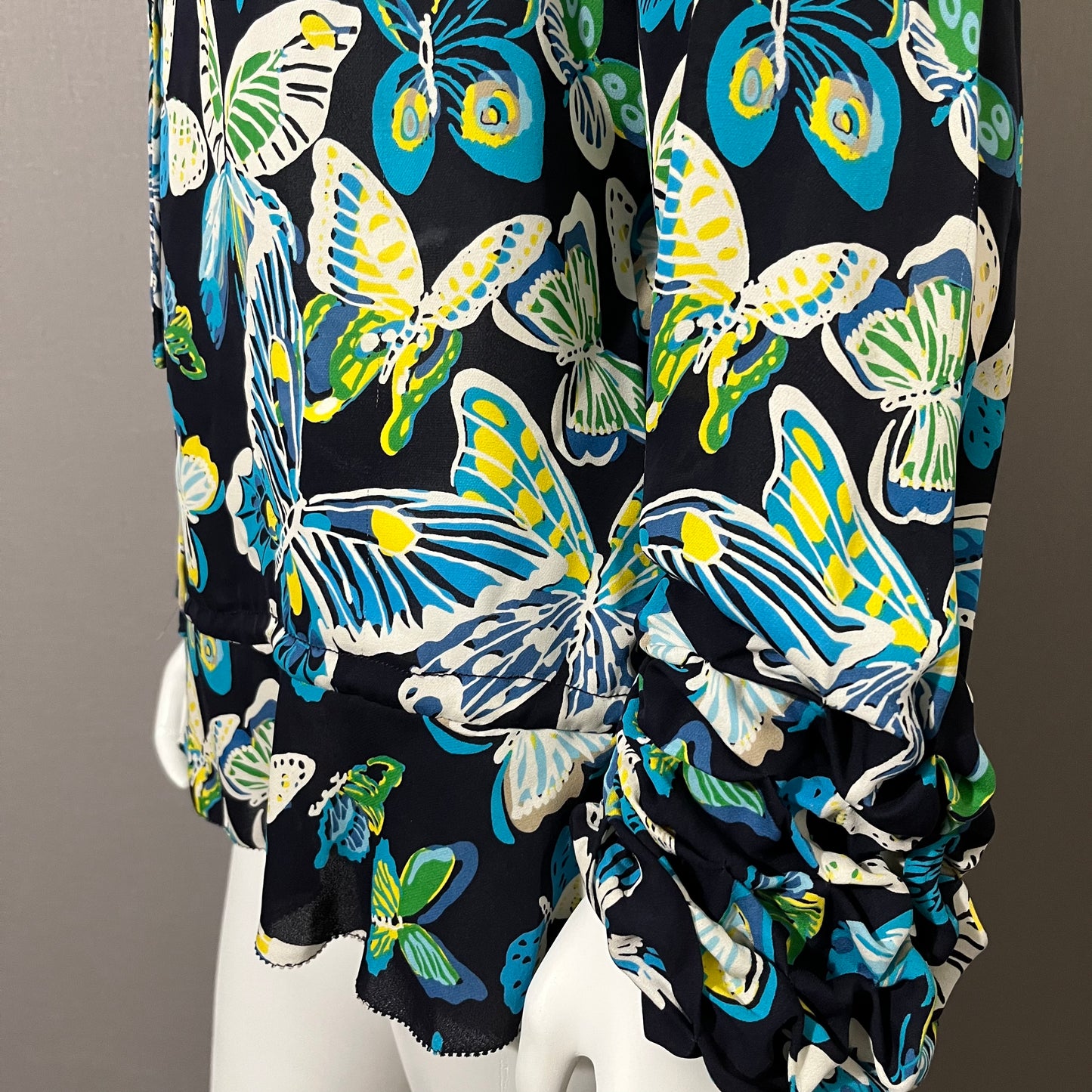 Details: Tory Burch blue butterfly silk blouse, with all over butterfly printed pullover top for added detail.