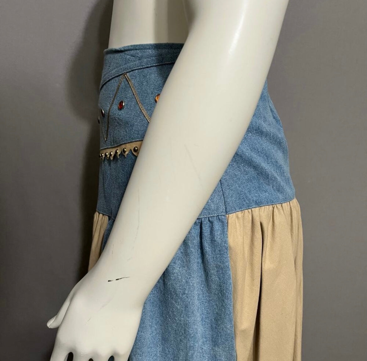 Highlights: Vintage 80s denim cotton pleated skirt. Skirt has jewels and is a great statement piece for the fall season.