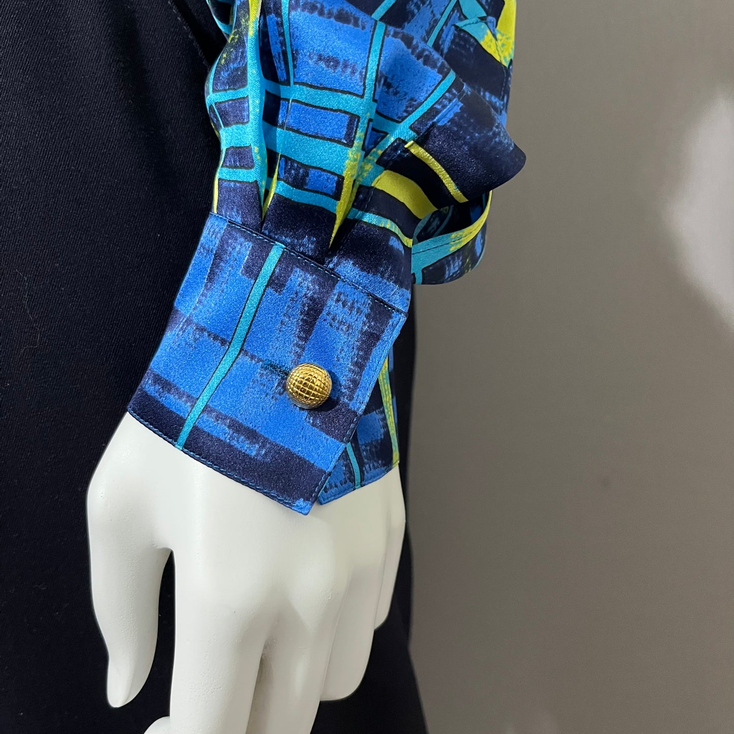 Vintage Escada Blue Stripe 100% Silk Gold Button Blouse Sz-8