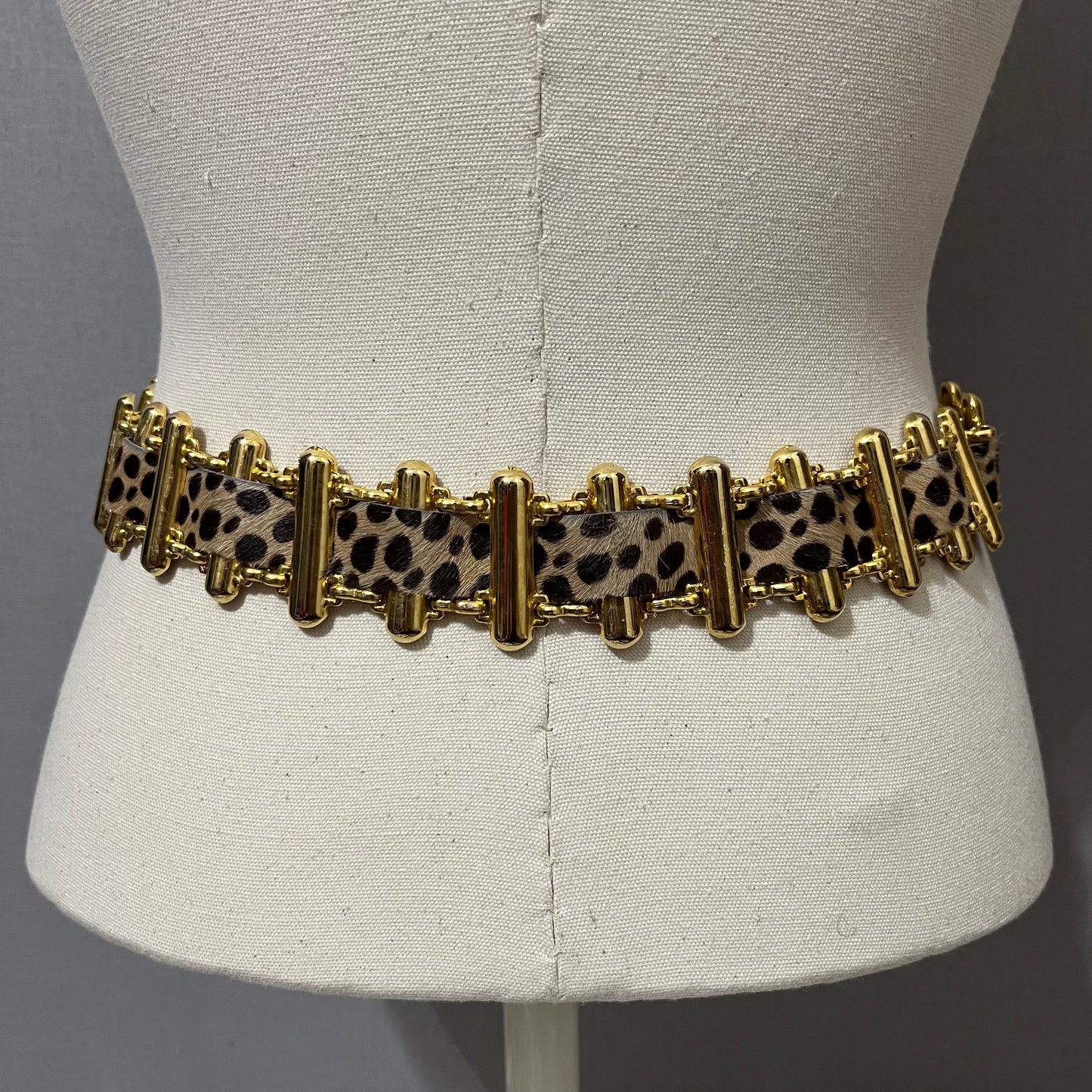 Vintage Doppia Vita Leopard Calf Hair Gold Tone Links Leather Belt Sz-OS