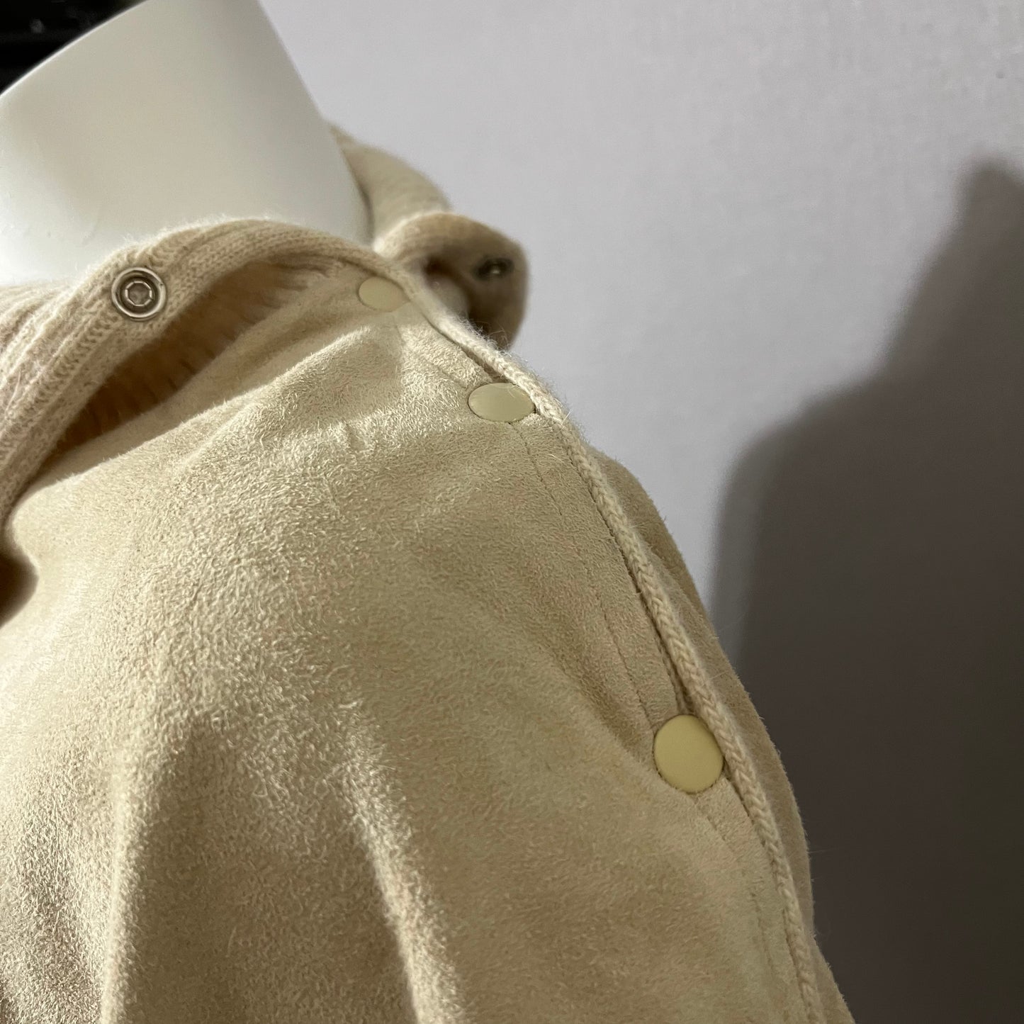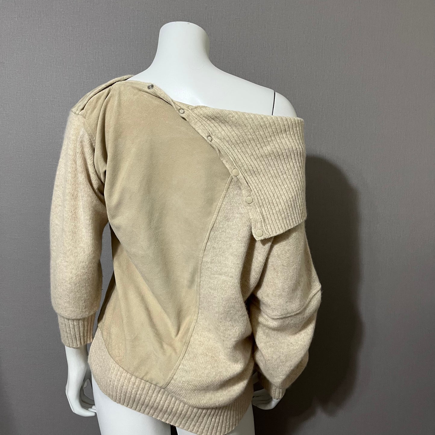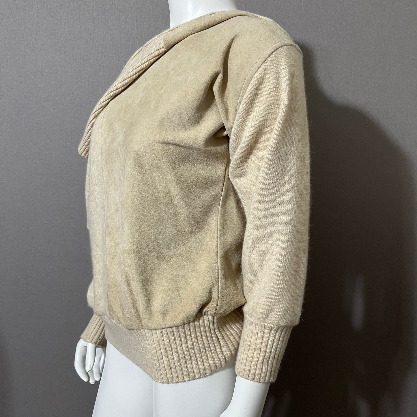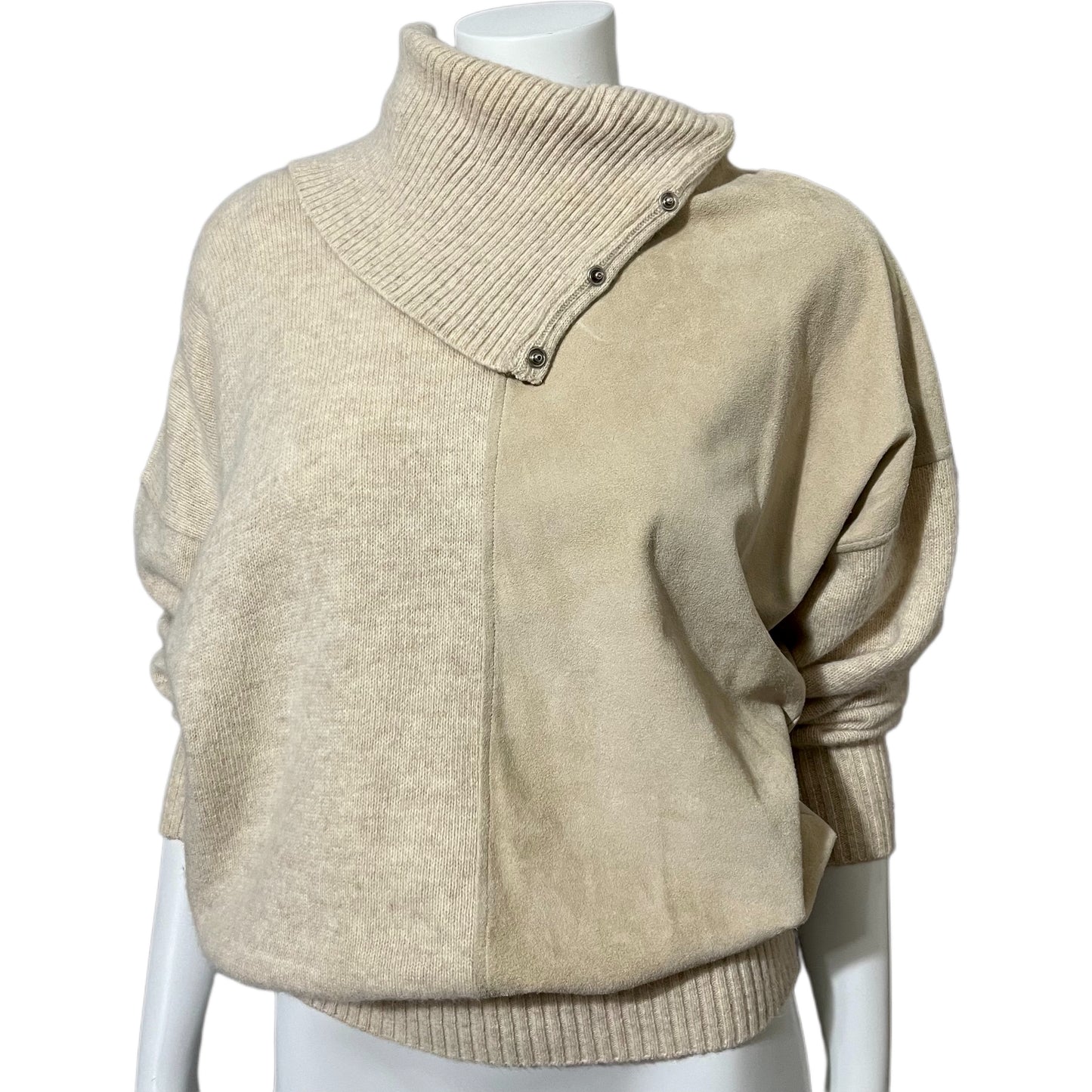 Details: Vintage Lambswool / Angora / Suede Leather Sweater, with turtleneck & button for added detail. Gently used condition, please see photos for flaws! Please look through all photos for any flaws to verify the condition. Major flaws will be disclosed.
