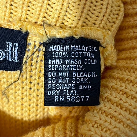 Details: Wainscott Mustard yellow cotton chunky turtleneck, with pullover cable knit for added detail. Gently used condition, please see photos for flaws! Please look through all photos for any flaws to verify the condition. Major flaws will be disclosed.